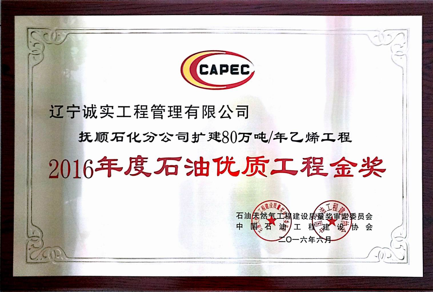2016年石油優質工程金獎(撫順石化...