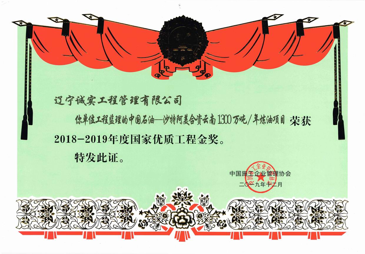 2018-2019年度國家優質工程金獎(中國石油-沙特阿美合資云南1300萬噸/年煉油項目)