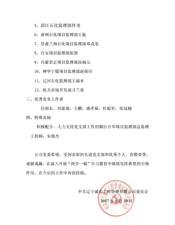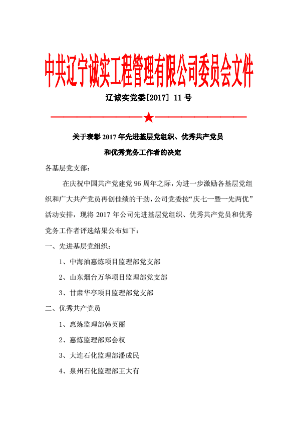 為慶祝中國共產黨建黨96周年,公司黨委于2017年6月30日下午在公司一樓會議室召開了慶祝建黨96周年暨“一優兩先”表彰視頻大會。公司機關、撫順各項目監理部及在撫的黨員同志在主會場參加了大會,中海油惠州項目監理部黨支部、甘肅華亭項目監理部黨支部、寧夏石化項目監理部黨支部、中化泉州項目監理部黨支部、廣西石化項目監理部黨支部、蘭州石化項目監理部黨支部、內蒙古君正項目監理部黨支部、神華寧煤項目監理部黨支部、煙臺萬華項目監理部黨支部設立視頻分會場。黨委委員馬駿主持了視頻大會。首先,公司黨委副書記馮玉琢同志宣讀了“一優兩先”表彰決定。接著,黨委書記孫學良結合公司實際做了慶祝建黨96周年的講話。最后全體黨員重溫的入黨誓詞,進行入黨宣誓。