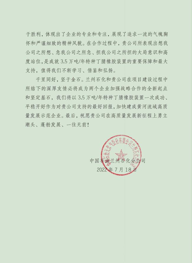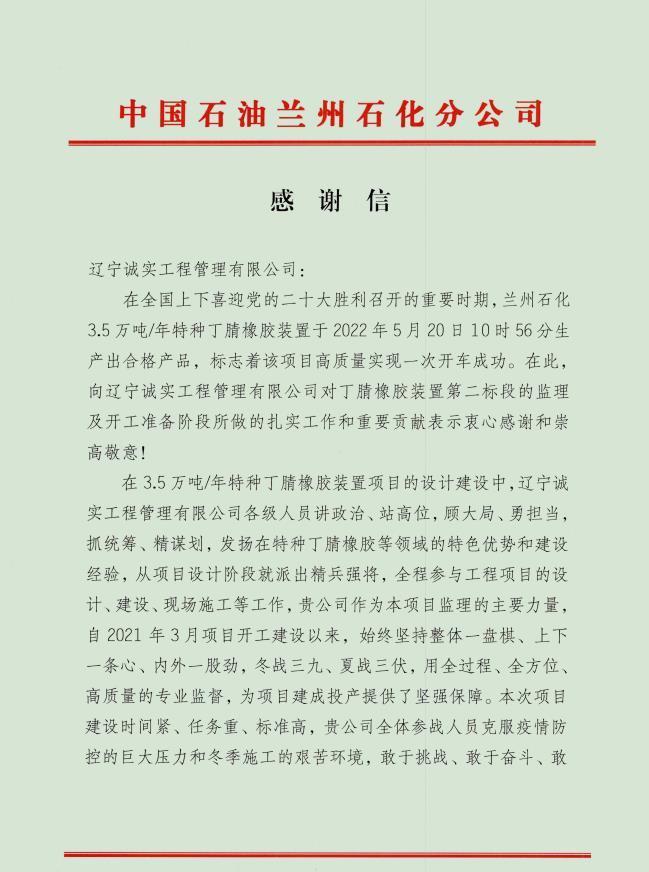 近日,由我公司監理的中國石油天然氣股份有限公司蘭州石化分公司--3.5萬砘/年特種丁腈橡膠項目喜獲業主表揚信。表揚信充分肯定了誠實監理的工作成果,對駐蘭州項目部全體監理工程師在項目建設過程中所付出的努力表示由衷的感謝。