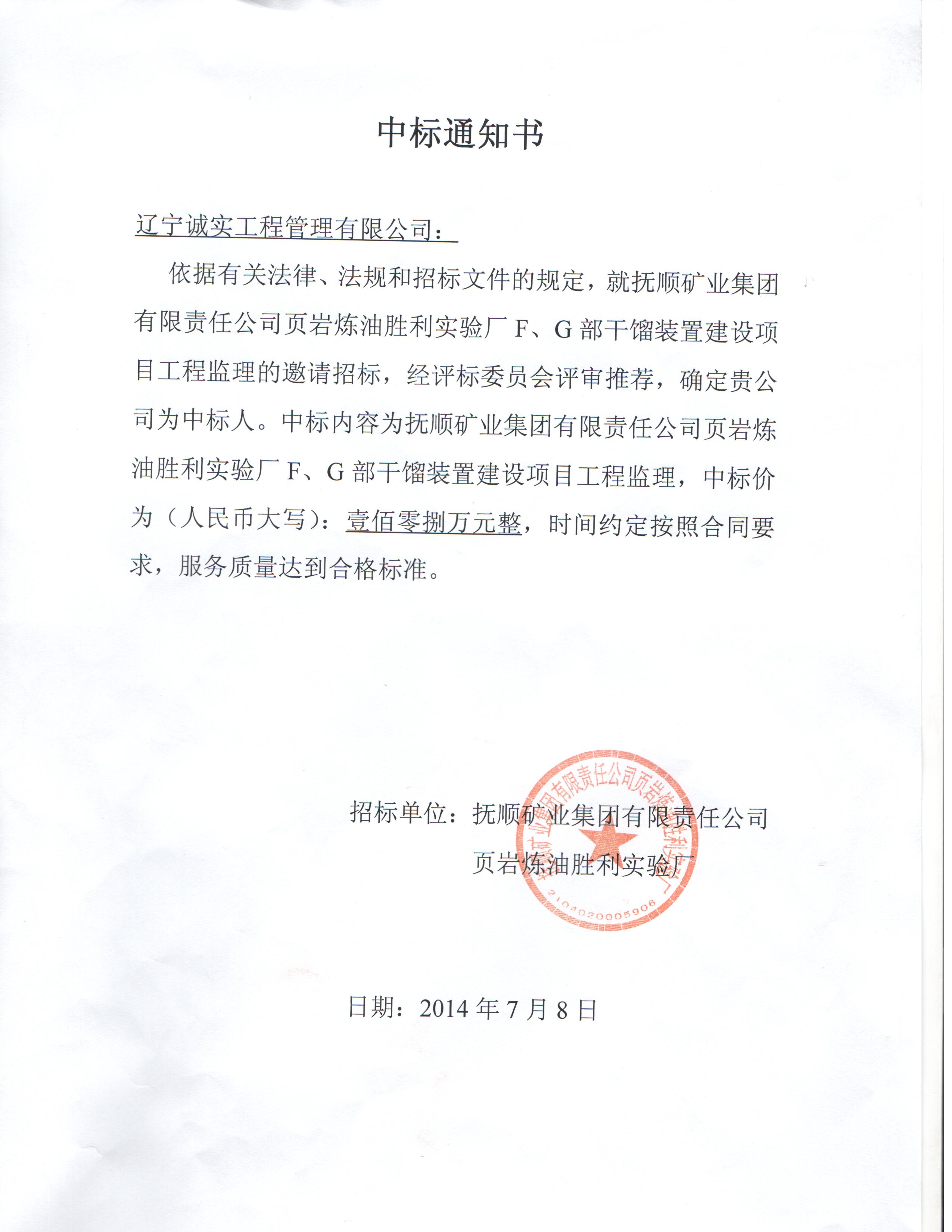 我公司成功中標撫順礦業集團有限責任公司頁巖煉油勝利實驗廠F、G部干餾裝置建設項目工程監理項目