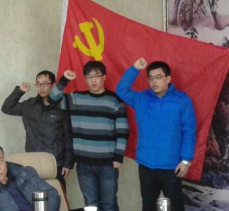 陳雷、鄧戎龍、王振三名同志在黨旗下莊嚴宣誓
