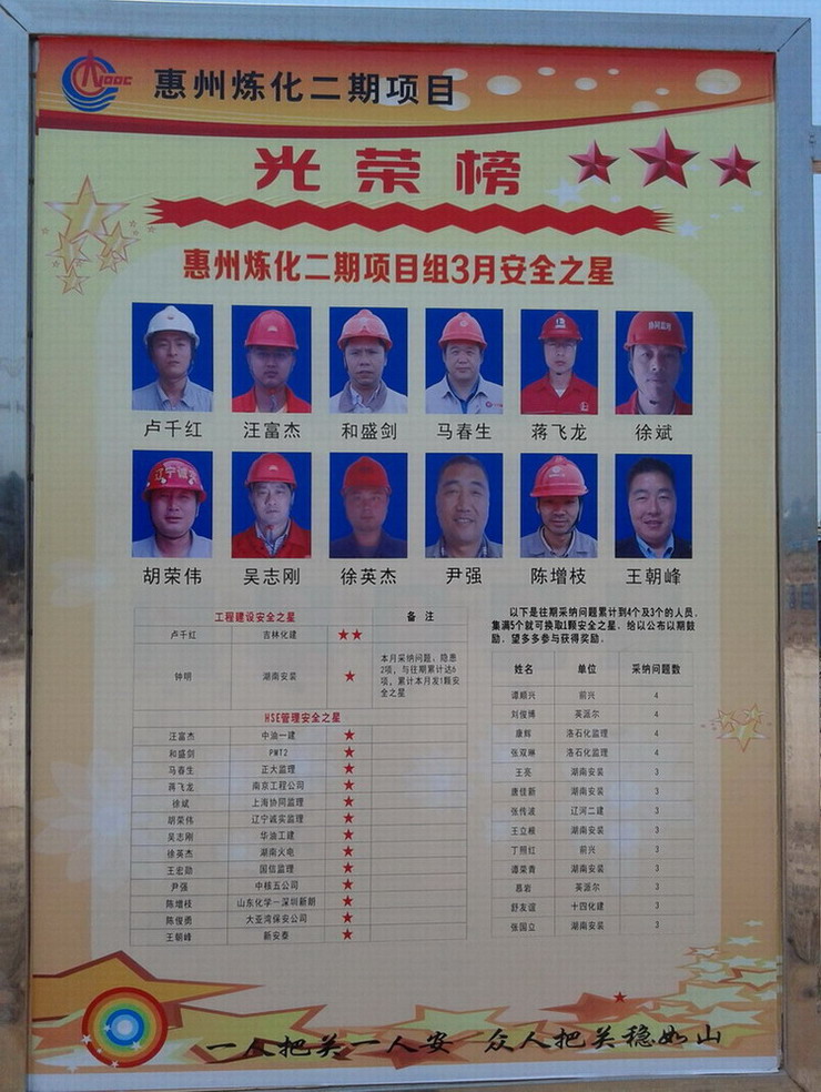 遼寧誠實工程管理有限公司中海石油惠州煉化項目監(jiān)理部HSE監(jiān)理工程師胡榮偉,喜登業(yè)主中海石油煉化公司惠州煉化分公司設立的三月安全之星光榮榜,體現了中海石油煉化公司惠州煉化分公司對我公司監(jiān)理服務的信任與認可。
